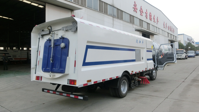 上裝配置: 帶2個中置掃盤;中置超寬吸嘴;江鈴64kW增壓副發(fā)動機;臺灣液壓閥;大力馬達;德國高壓水泵;威龍低壓泵;3mm不銹鋼垃圾箱;不銹鋼水箱;德國控制器;尾部箭頭燈; 機油、垃圾箱、水箱均帶防溢或低位報警裝置;倒車及洗掃狀態(tài)室內(nèi)監(jiān)視器;多種語音提示;防傾倒垃圾翻車保護、檢修安全保護;20m高壓沖洗卷盤;刷臂轉動機構使用德國進口高新耐磨工程隔套,免打黃油;精密冷彎無縫液壓油管;運動控制器一鍵電腦控制。 ![]() 產(chǎn)品功能特點